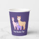A paper cup with a whimsical illustration of a cute family of alpacas - a yellow father alpaca, a pink mother alpaca, and a purple child alpaca.