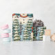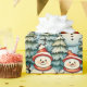 Christmas wrap with snowmen in warm red scarves and warm knit hats and a pretty green pine tree background.
