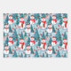 Three sheets of cute snowmen in the winter wonderland forest. Christmas wrap with snowmen in warm red scarves and warm knit hats and a pretty green, red and blue pine tree background.