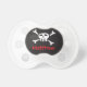 Cute, personalised name pacifier featuring a white cartoon skull and crossbones on a black background. Add the baby's name or other text. Fun design for little boys. Makes cute baby shower gifts.