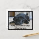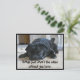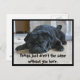 Cute and lazy black pug puppy postcard with text that reads, "Things just aren't the same without you here."