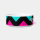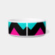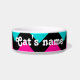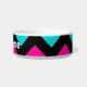 A fun, fashionable, and funky chevron stripes pattern in hot pink, turquoise, and black on a cat food dish. Add your pet's name to it.
