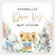Cute gender unknown baby shower animals in masks covid virtual baby shower. White flowers botanical foliage and elephant, lion and zebra in face masks. Script text, part of a collection available in different colour ways.