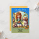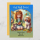 Get Well Soon card featuring a painting of a girl surrounded by her animal friends: butterflies, and a cute cat and dog. Butterflies are a symbol of speed, referring to a fast recovery.