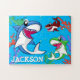 This cute illustrated cartoon shark design is great for the shark lover in your life. These blue, red, and green sharks will make building this puzzle extra fun for kids, both boys and girls. The white and blue text name is customisable!