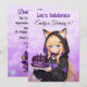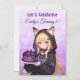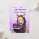 Cute birthday invitations for a girl's birthday party. A sweet anime girl in a fox ears hoodie holding a purple and black birthday cake. On the back is a cute anime dragon and your birthday party details.