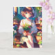Thinking about you card. Sweet anime girl sitting on her front steps on a summer day holding a plant. Cute birthday card for anyone who loves plants and anime.
