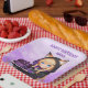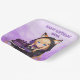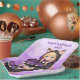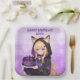 Cute personalized birthday paper plates for a girl's birthday party. A sweet anime girl in a fox ears hoodie holding a purple and black birthday cake.