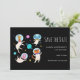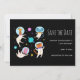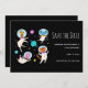 Save the date card with an image of astronaut animals in see-through helmets floating in space. Giraffe, mouse, cat & rabbit. So adorable and fun.