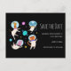 Save the date postcard with an image of astronaut animals in see-through helmets floating in space. Giraffe, mouse, cat & rabbit. So adorable and fun.