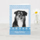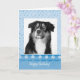 A cute photo of Australian Shepherd dog wishing "Happy Birthday" with blue dots.