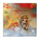 A cute orange-haired fairy wearing a crown of autumn leaves sits by a piles of fallen leaves. The words “Happy Autumn” can be removed or changed as desired.