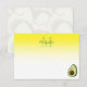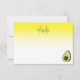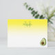 A cartoon style avocado. Custom note cards with monogram. White and yellow background. Edit initial and name to customise.