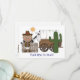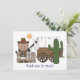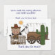 MATCHING INVITATION AND POSTAGE STAMP AVAILABLE. Colourful Western theme cartoon art. Too cute! Customisable thank you card for a boy baby shower, baptism party, or toddler boy birthday. Fun design features a brown-skinned little cowboy dressed in Western wear: brown cowboy boots, cowboy hat, vest, a sleeveless blue shirt, a diaper. He is standing with his black and white pony, an Arizona saguaro (sahuaro) cactus, an Old West covered wagon, a golden yellow sun. Personalise - pick a background colour, too! With a little help from my friends at www.scrappindoodles.com. From She Wolf Medicine.