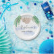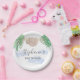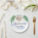 This fun baby shower paper plate features a sweet baby sloth hanging from a branch, with green watercolor jungle leaves and blue clouds.