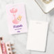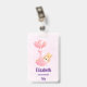Personalised name badge with an adorable illustration. A little baby bunny wearing a tiny golden crown. Carried by balloons in a pink heart blanket.