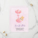 Save the date card with an adorable illustration of a little brown baby bunny wearing a tiny golden crown. Carried by balloons in a pink heart blanket.