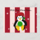 Send a greeting featuring this cute little penguin wearing a red hat and holding a green holiday ornament. A striped background with little white stars.