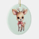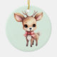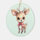 An ornament with an illustration of an adorable baby deer. Big eyes big ears with a large head and little brown antlers. Wearing a big red bow.