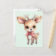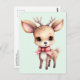 A postcard with an illustration of an adorable baby deer. Big eyes big ears with a large head and little brown antlers. Wearing a big red bow.