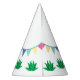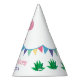 Cute dinosaur birthday party hat featuring a happy little girl dinosaurs with jungle plant and colourful flags.