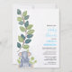 the design shows a baby shower invitation in sky blue and black typography and calligraphy at the right side and a baby elephant with eucalyptus at the left side. the design is cute and will be perfect for your baby shower.