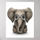 This cute design features a small baby elephant with large ears and deep black eyes. The calf is sitting with its front legs beside each other and is looking forward with its trunk hanging down. The over sized head and small body along with the details in the skin create a beautiful combination of a cartoon and realistic look. Reading glasses sit on the elephants nose which gives the pattern a playful look and intelligent feel. This unique design is an adorable example of this wonderful and majestic creature.