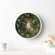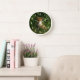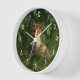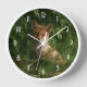 A clock with a photograph featuring a cute little baby fox with red and white fur. Surrounded by lush green leaves and grasses.