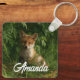 A keychain with a photograph featuring a cute little baby fox with red and white fur. Surrounded by lush green leaves and grasses.