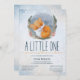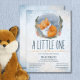 A little one is coming this winter. Cosy winter watercolor design featuring modern handwritten style script, orange cute sleeping baby fox on snowly background. The text can easily be personalised for a unique one of a kind design for your special day.