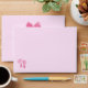 A cute baby shower envelope for a precious baby girl with a pastel pink argyle pattern background, embellished with sweet little baby footprints and a trendy pink ribbon tied into a bow. Flat printed image, not actual ribbon.