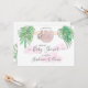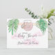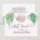 This pretty baby shower invitation features a sweet baby sloth hanging from a branch, framed with green watercolor jungle leaves and pink clouds.