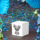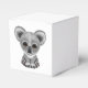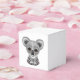 This cute design features a small koala bear cub with large ears and deep black eyes. The koala is sitting down with its paws beside each other and is looking forward which creates a symmetrical pattern. The over sized head and small body along with the details in the fur create a beautiful combination of a teddy bear cartoon and realistic look. This unique design is an adorable example of this wonderful and curious creature.