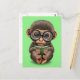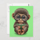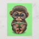 This adorable design features a small brown baby monkey with large ears. The monkey is sitting down with its feet beside each other and hands in its lap. Reading glasses sit on the monkeys nose and a small open book sits on its lap which gives the pattern a playful look and intelligent feel. The tiny monkey is looking forward with large round eyes. Its head is slightly tilted to one side creating a curious look and feel. The over sized head and small body along with the details in the fur create a beautiful combination of a cartoon and realistic look. This unique design is perfect for all monkey and book lovers.