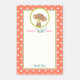 Baby shower sticky notes in large size. With a cute baby monkey with a pacifier in his mouth Inside an olive green circle. The background is an orange and white polka dot pattern. The letters in the word baby are hanging down from a boho style arrow. Text says thank you and is ready to be customised with your guest of honour's name.