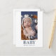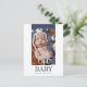 Modern photo baby birth announcement postcard, featuring a baby with crocheted teddy bear and hat; with the words: "oh baby"; in a unique vertical style card. Elegant contemporary style.