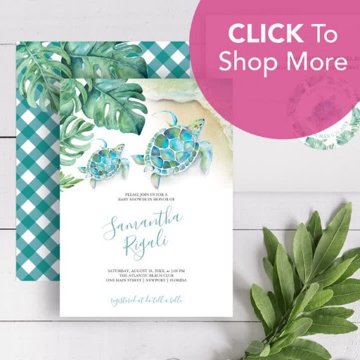 These cute baby shower invitations are perfect for celebrating a baby girl! Featuring whimsical sea turtles and ocean animals in vibrant watercolor shades of pink and blue, these under-the-sea themed invitations bring a tropical, summer beach vibe to your celebration. The unique square format adds a touch of charm, and the back of the card showcases a delightful pink gingham pattern with additional tropical elements. Use the template fields to customise for a sip and see. Ideal for any tropical-themed baby shower, these invitations will set the perfect tone for your special day. Explore the matching invitation suite at www.zazzle.com/dotellabelle. Unique watercolor art and design by Victoria Grigaliunas of Do Tell A Belle on Zazzle.