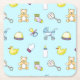 Cute pattern with baby items on the blue background: teddy, rubber ducky, pacifier, baby bottle, stroller... For a baby boy.