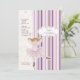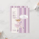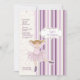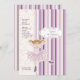 A charming invitation featuring a "cutout" ballerina against a pink and purple stripe background overlaid with a scalloped, flower and heart pattern. Perfect as a birthday party invitation or a dance recital.