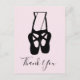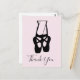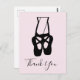 Thank you postcard with a black and white illustration of a ballet dancers lower legs and ballet slippers, standing on her toes, en pointe. Pink background.
