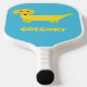 This personalised pickleball paddle (say that three times fast!) is bananas. On the front is an illustration of a cute dachshund style dog made out of yellow bananas. There's a spot to add a name below the graphic. On the reverse side is a coordinating pattern of bananas dogs along with some green tropical palm leaves against a bright blue background.