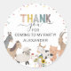 Cute barnyard party thank you stickers featuring a simple white background, adorable farm animals including a cow, goat, pig, sheep, donkey, horse, rabbit, duck & a rooster, a thank you message, and the childs name.