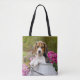 A young puppy-eyed tricolor Beagle puppy is sitting in a milk churn admist pink flowers The Beagle is a scenthound dog breed with a gentle temperament. A cute doggy photo taken by Katho Menden. This all-over printing shopping tote bag is a gift idea for dog lovers.