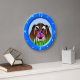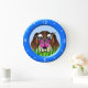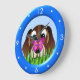 Beagle Puppy Dog and Butterfly – BEBY100 © Sunny Mars Designs. This adorable custom childrens large size round wall clock features a cartoon vector illustration of a cute brown beagle puppy dog with a pretty pink butterfly sitting on it's nose while he's staring at it, with a blue ring around it. Perfect gift for kids.