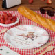 These cute baby shower paper plates feature a girl teddy bear flying a plane among fluffy clouds with text "We can bearly wait" and personalised with your shower details.