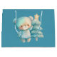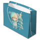 Gift bag with an adorable illustration. A cosy bear with stars and sparkles in its fur. Standing beside a Christmas tree. Pastel blue-green colour. Whimsical and cute.