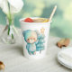Paper cups with an adorable illustration. A cosy bear with stars and sparkles in its fur. Standing beside a Christmas tree. Pastel blue-green colour. Whimsical and cute.