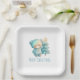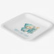 Paper plates with an adorable illustration. A cosy bear with stars and sparkles in its fur. Standing beside a Christmas tree. Pastel blue-green colour. Whimsical and cute.