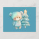 A postcard with an adorable illustration. A cosy bear with stars and sparkles in its fur. Standing beside a Christmas tree. Pastel blue-green colour. Whimsical and cute.