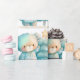 Wrapping paper with an adorable illustration. A cosy bear with stars and sparkles in its fur. Standing beside a Christmas tree. Pastel blue-green colour. Whimsical and cute.
